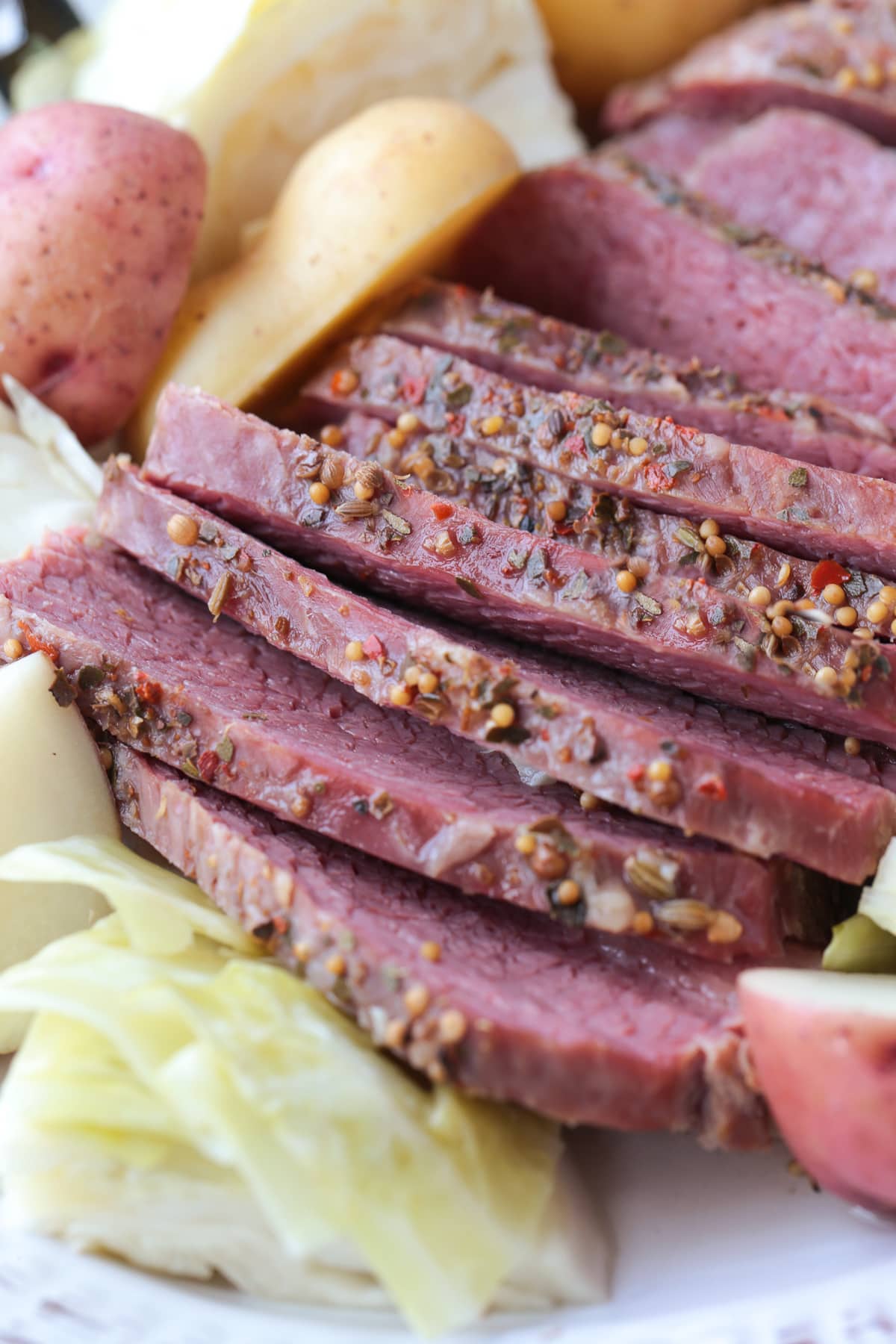 Corned beef is made from a piece of beef called a brisket. Brisket is a tougher cut of meat so it’s typically braised or smoked, used in slow cooker recipes, or in this case brined.