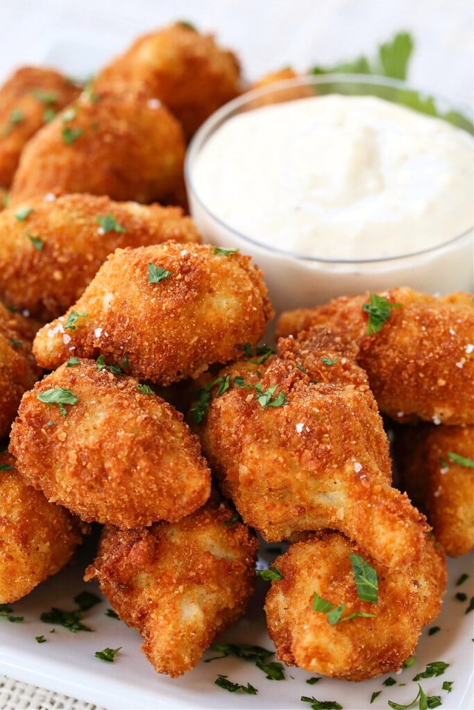 Fried Artichoke Hearts are so crispy and addicting! We love making these hot appetizers for game days or holidays. Make our roasted garlic aioli to serve alongside for dipping!