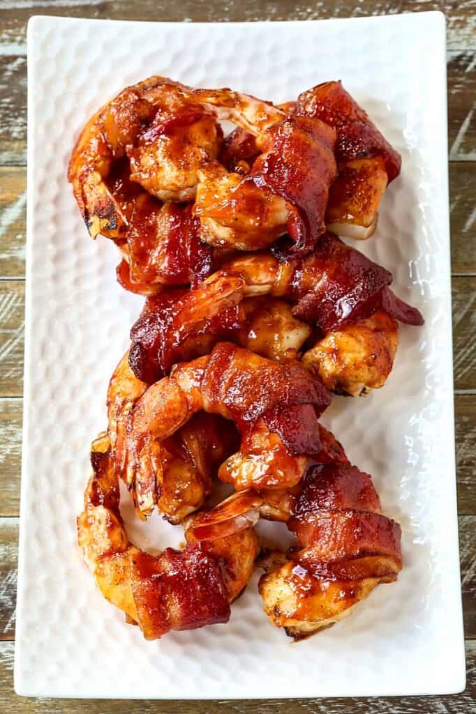 This easy bacon wrapped shrimp recipe is coated in the most addicting BBQ glaze! Serve these shrimp for appetizers or dinner!