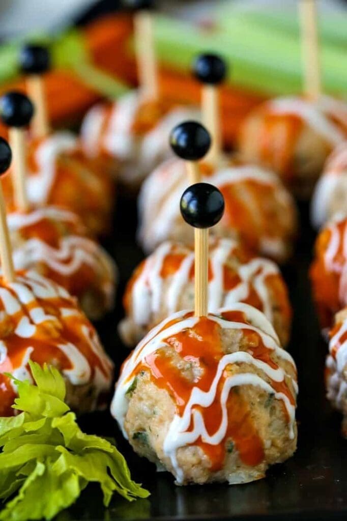 These Buffalo Chicken Meatballs are always the first appetizer to go! A juicy, cheesy chicken meatball drizzled with Buffalo sauce and either Ranch or Blue Cheese dressing. So easy to make ahead of time, then warm and add the sauce before serving!