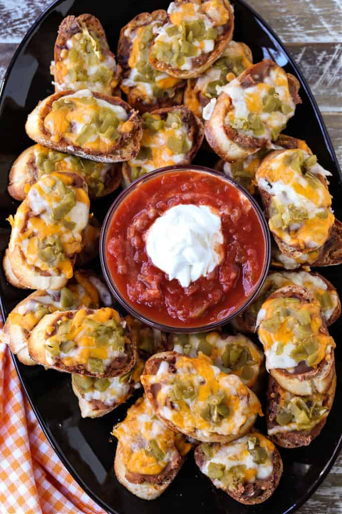 This Cheesy Taco Crostini can be served as appetizers or used as a dipper for taco soup! Serve with salsa, sour cream and guacamole for dipping!