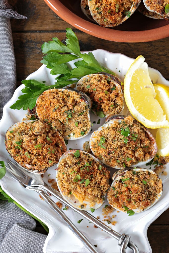 These easy Baked Clams are always a hit! Fresh, steamed clams topped with a buttery breadcrumb topping. A squeeze of lemon and a drizzle of butter is all you need!