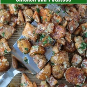 Garlic Parmesan Chicken and Potatoes is the sheet pan dinner of your dreams! Tender, juicy chicken thighs and crispy potatoes tossed with our famous homemade garlic parmesan sauce. On the table in less than 30 minutes!