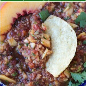 Fresh and flavorful Peach Mango Salsa only takes minutes to make! Juicy peaches and sweet mango combined with mild jalapeño and tomatoes. The perfect pairing with tortilla chips for dipping, or as a topping for chicken, fish or tacos and so much more!