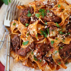Freeze: This short rib ragu freezes wonderfully. If you’re planning on making it ahead for a special meal, freeze the sauce in an air tight container for up to 3 months. Defrost in the refrigerator and then warm and toss with pasta.